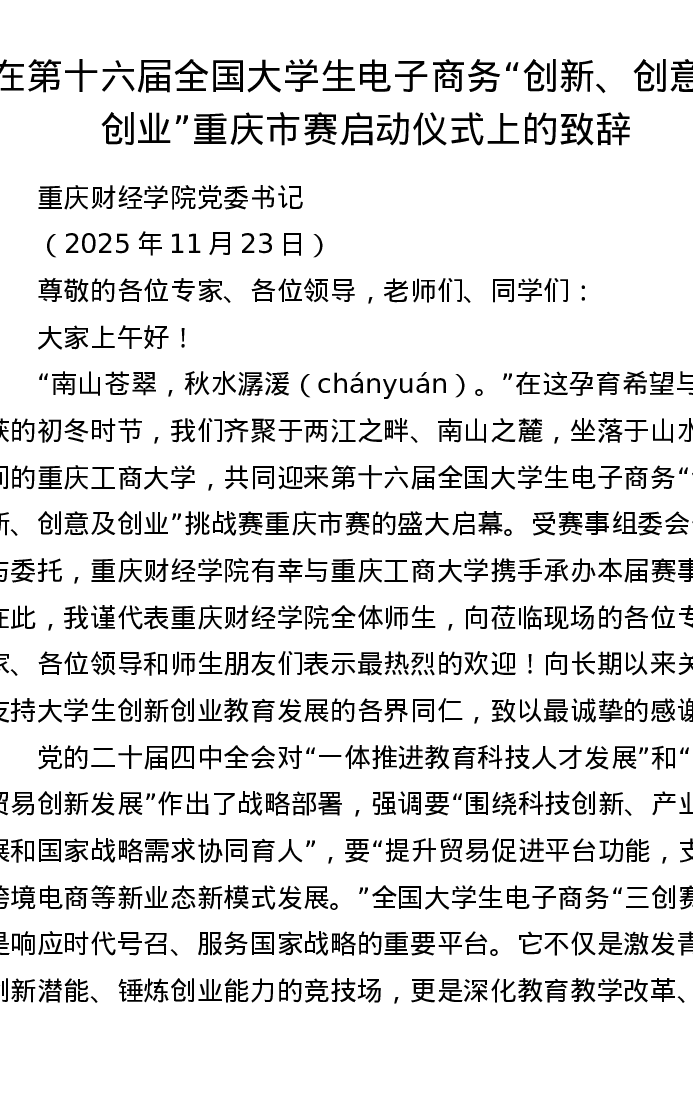 在第十六届全国大学生电子商务创新、创意及创业重庆市赛启动仪式上的致辞