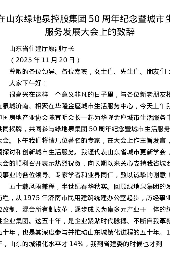 在山东绿地泉控股集团50周年纪念暨城市生活服务发展大会上的致辞