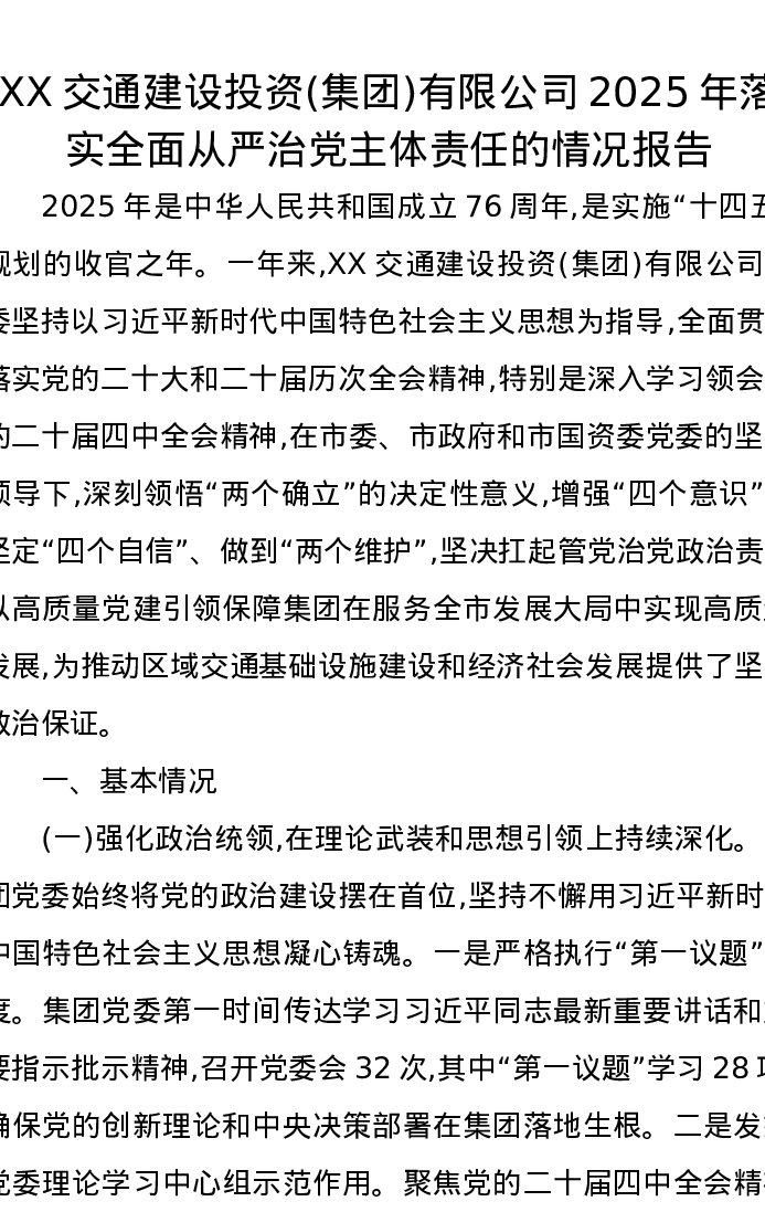 XX交通建设投资(集团)有限公司2025年落实全面从严治党主体责任的情况报告