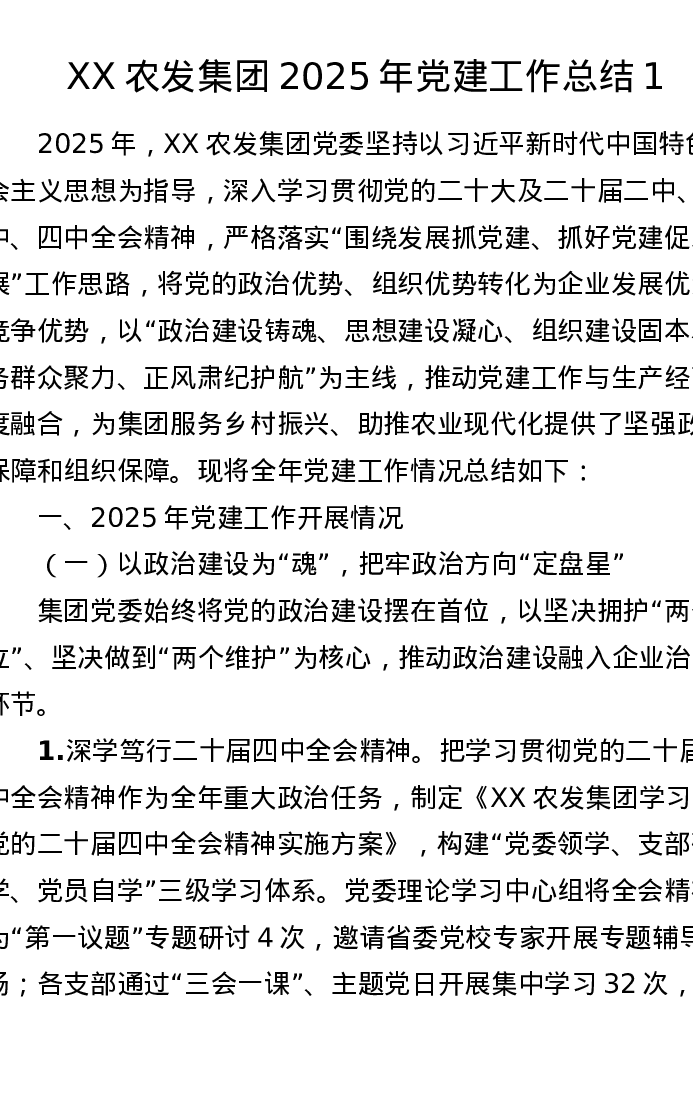 XX农发集团2025年党建工作总结1