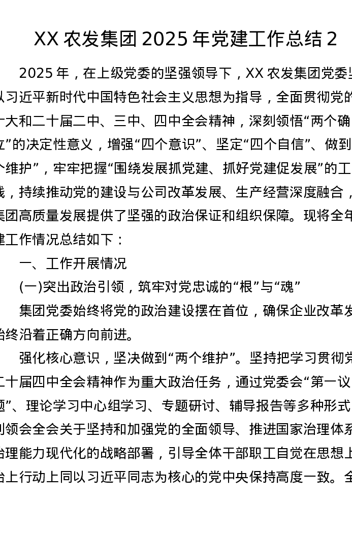 XX农发集团2025年党建工作总结2