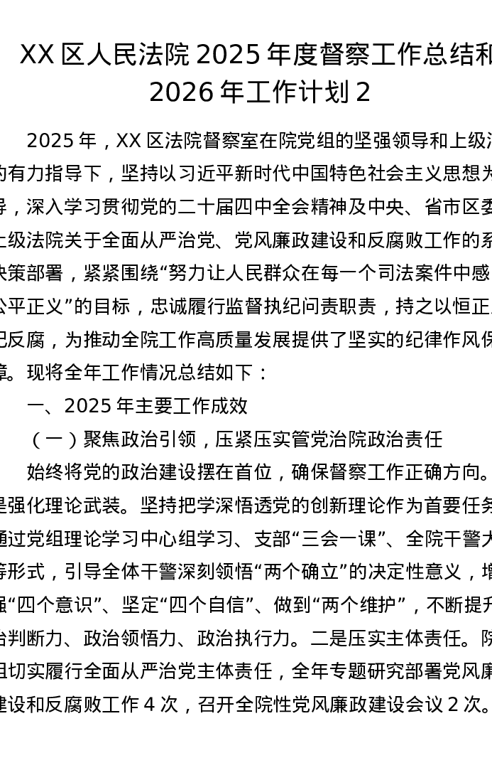 XX区人民法院2025年度督察工作总结和2026年工作计划2