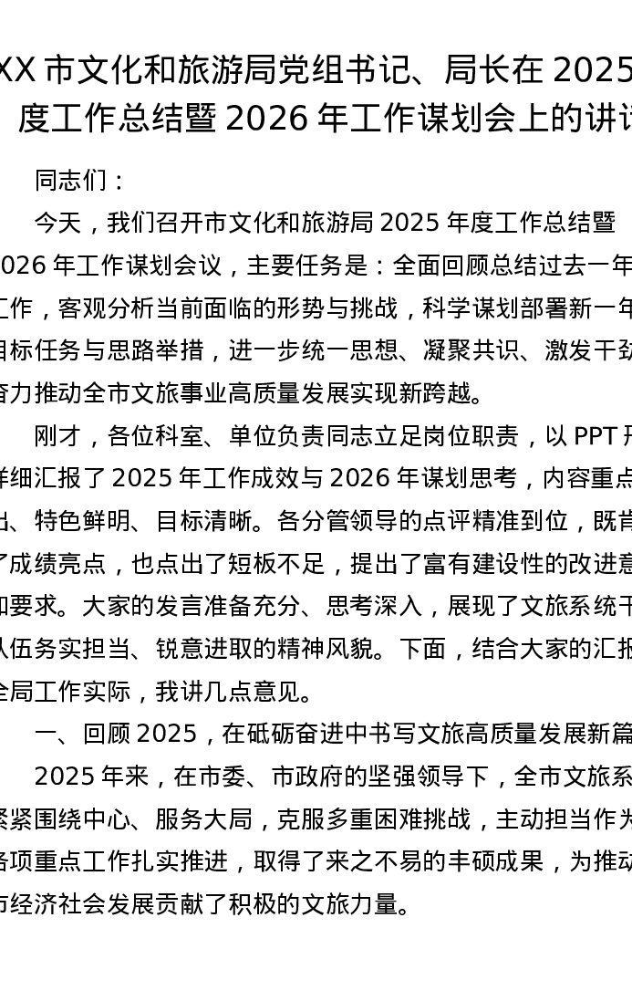 XX市文化和旅游局党组书记、局长在2025年度工作总结暨2026年工作谋划会上的讲话