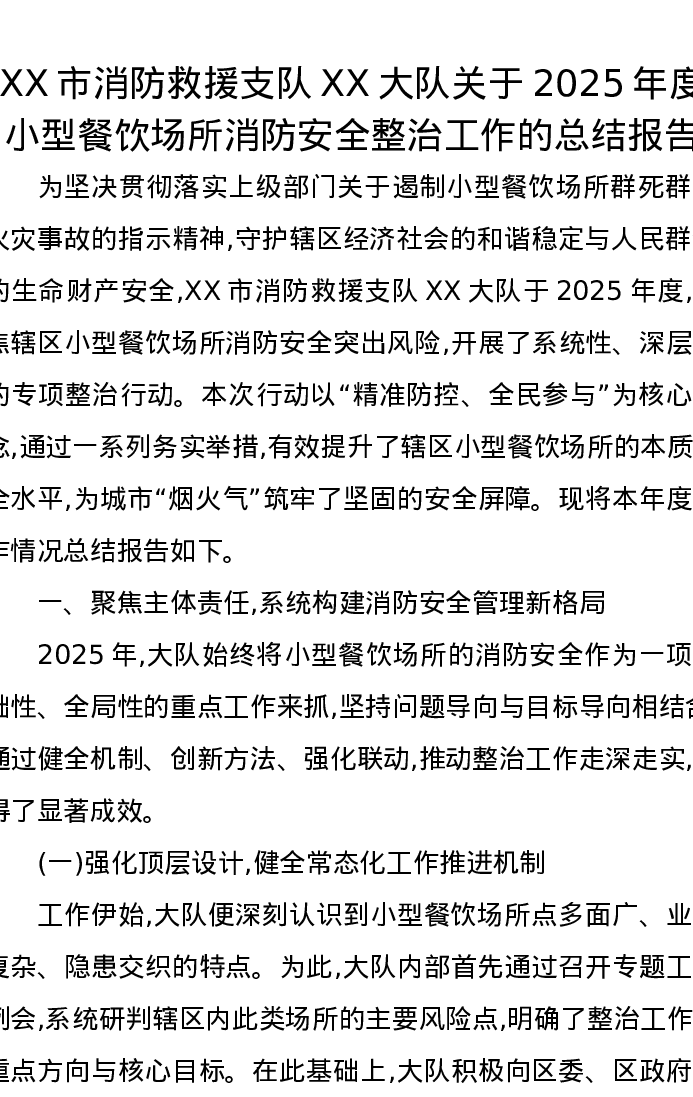 XX市消防救援支队XX大队关于2025年度小型餐饮场所消防安全整治工作的总结报告