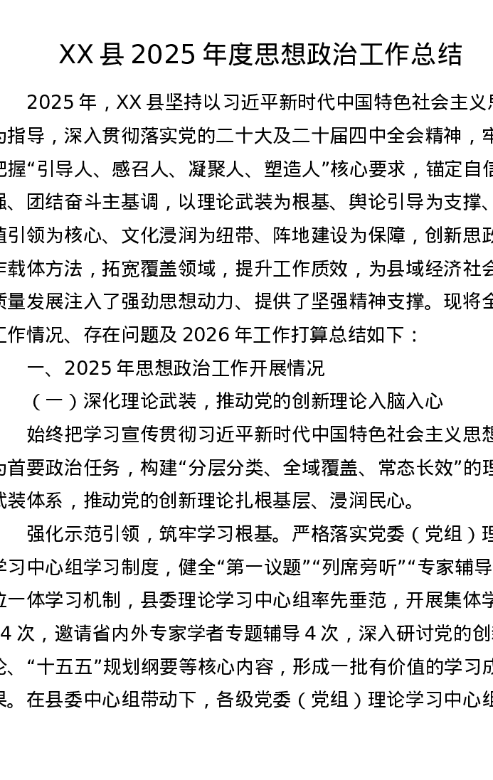 XX县2025年度思想政治工作总结
