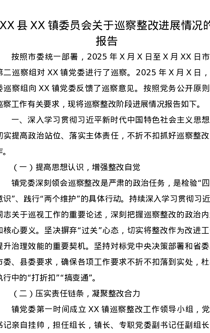 XX县XX镇委员会关于巡察整改进展情况的报告