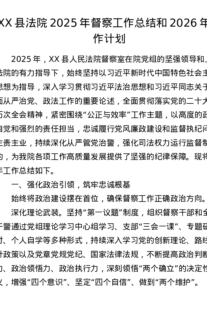 XX县法院2025年督察工作总结和2026年工作计划