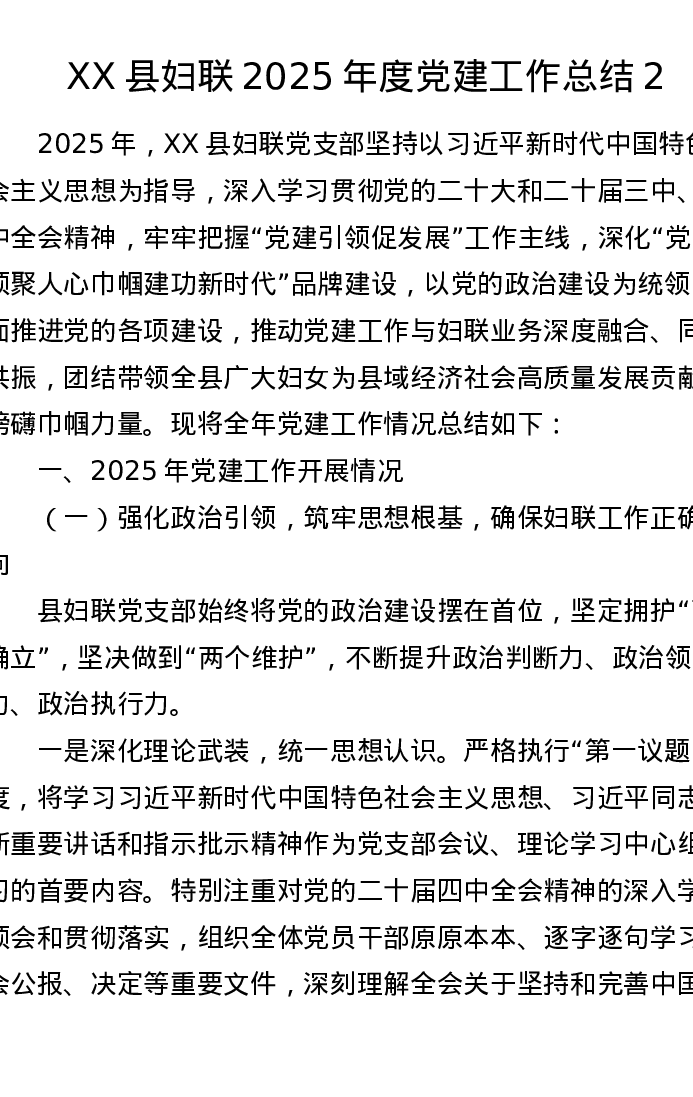 XX县妇联2025年度党建工作总结2