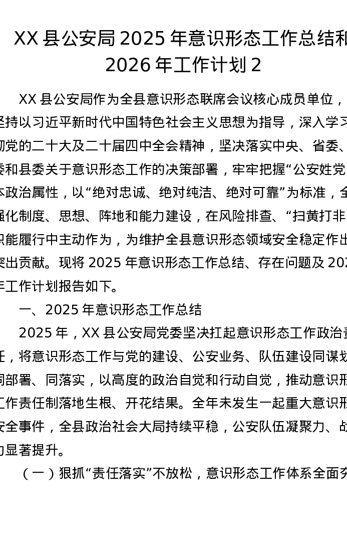 XX县公安局2025年意识形态工作总结和2026年工作计划2