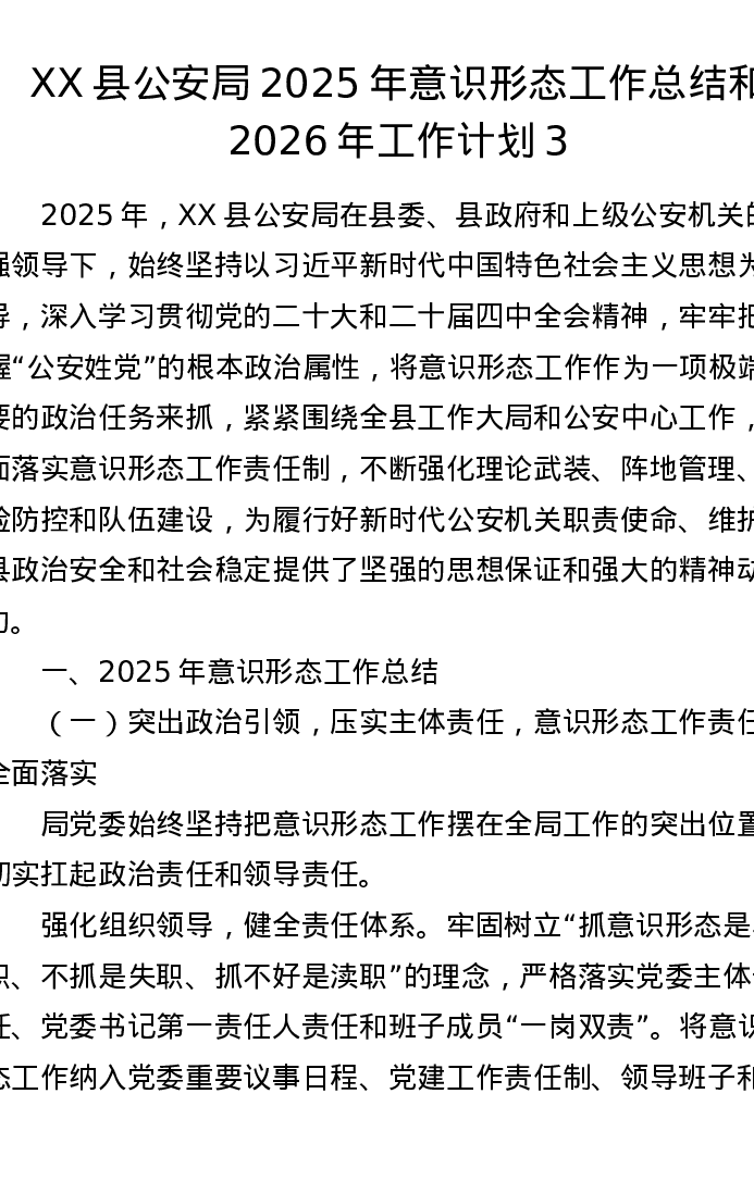 XX县公安局2025年意识形态工作总结和2026年工作计划3