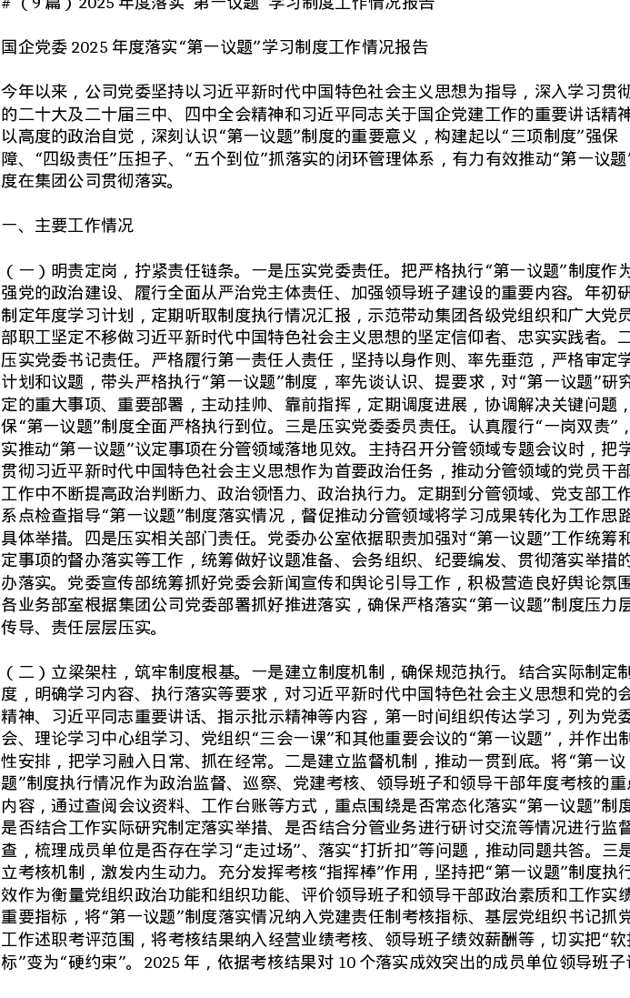 汇编:2025年度落实第一议题学习制度工作情况报告9篇