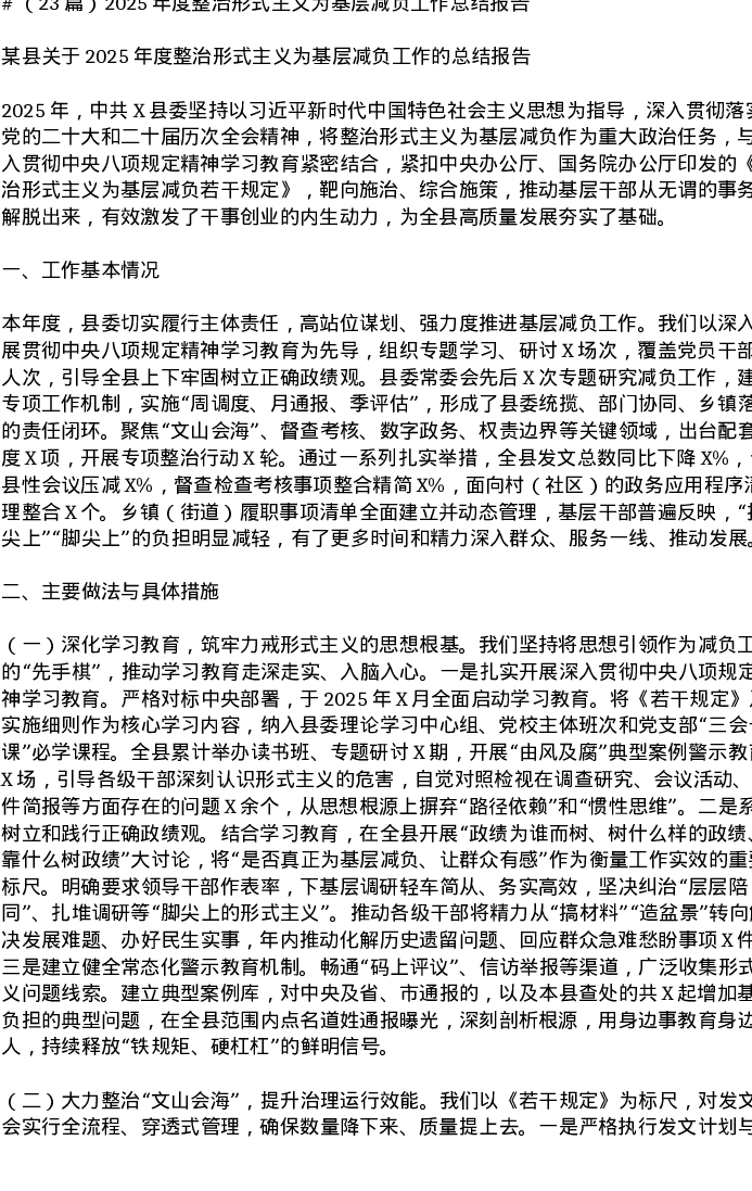 汇编:2025年度整治形式主义为基层减负工作总结报告23篇