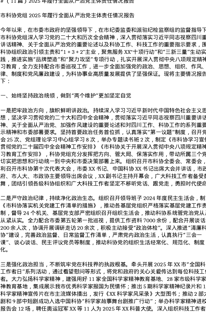 汇编:2025年履行全面从严治党主体责任情况报告11篇