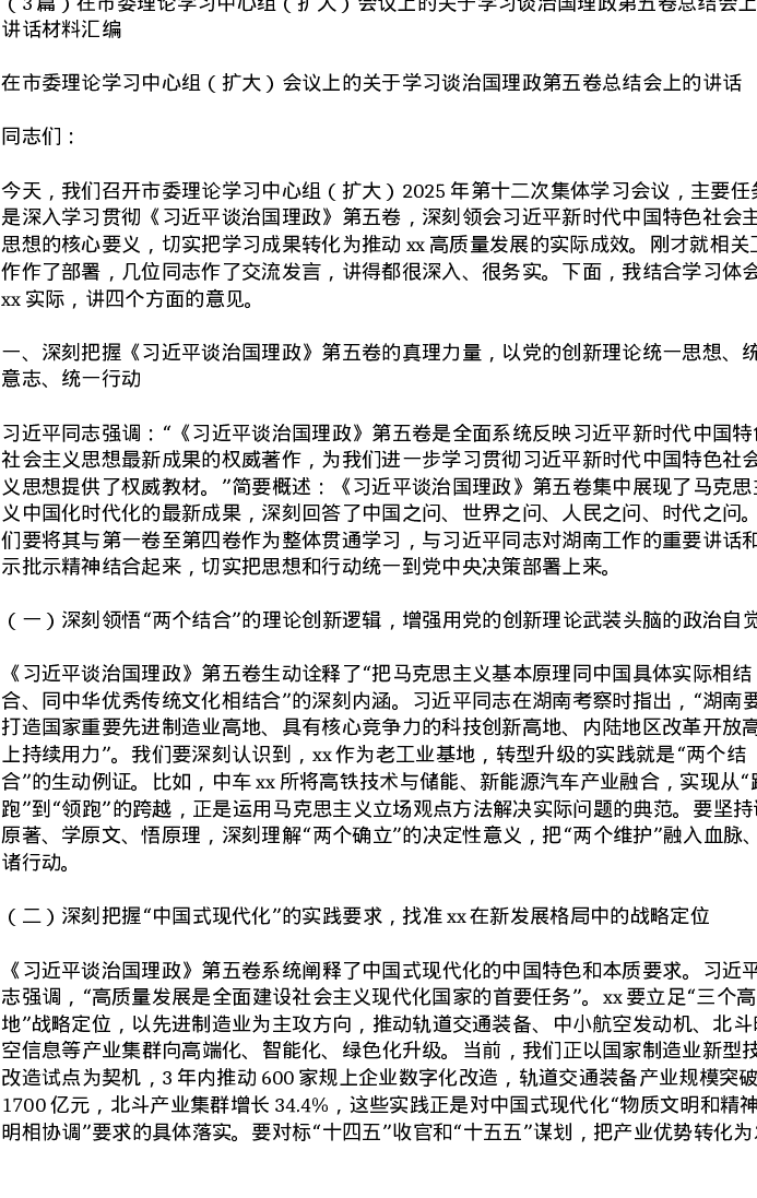 汇编:在市委理论学习中心组(扩大)会议上的关于学习谈治国理政第五卷总结会上的讲话3篇