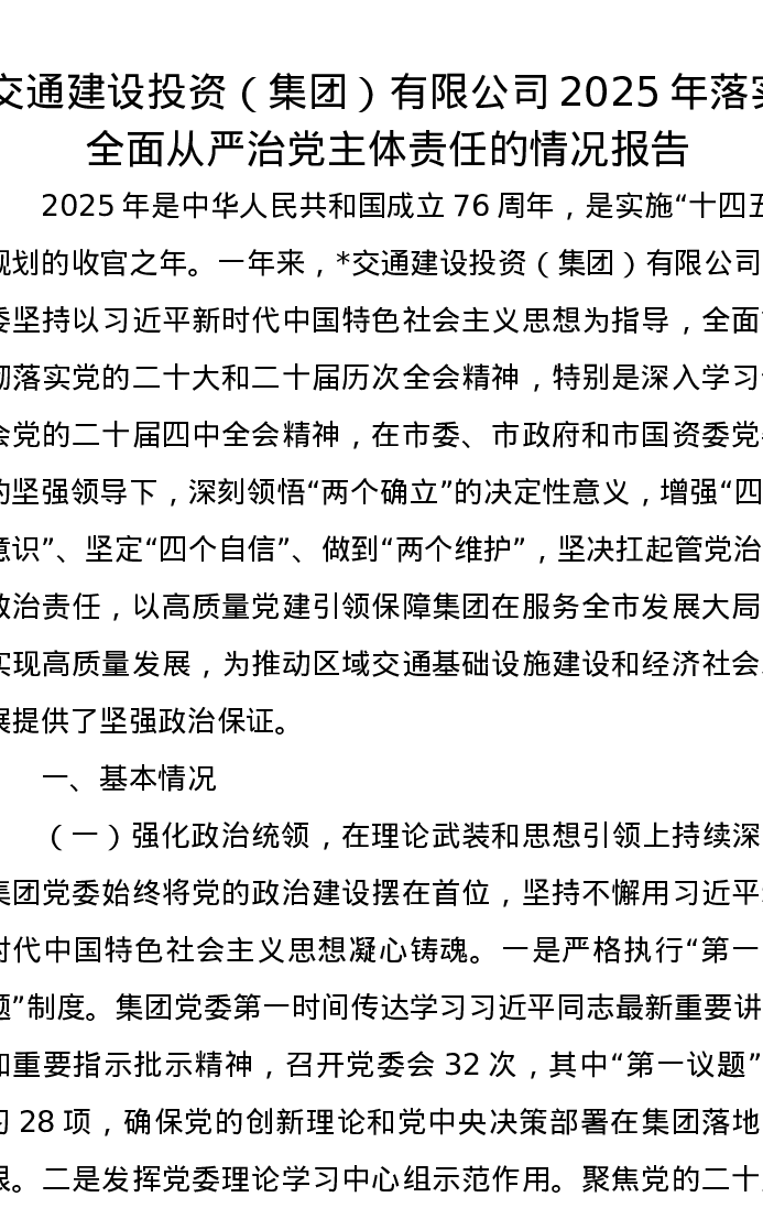 交通建设投资(集团)有限公司2025年落实全面从严治党主体责任的情况报告