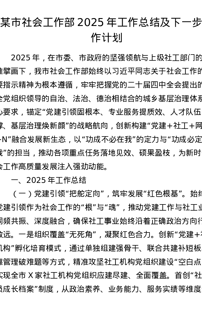 某市社会工作部2025年工作总结及下一步工作计划