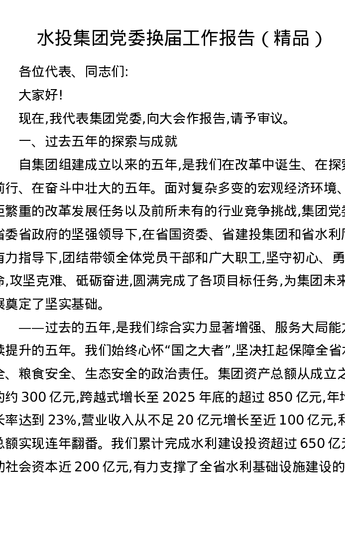 水投集团党委换届工作报告
