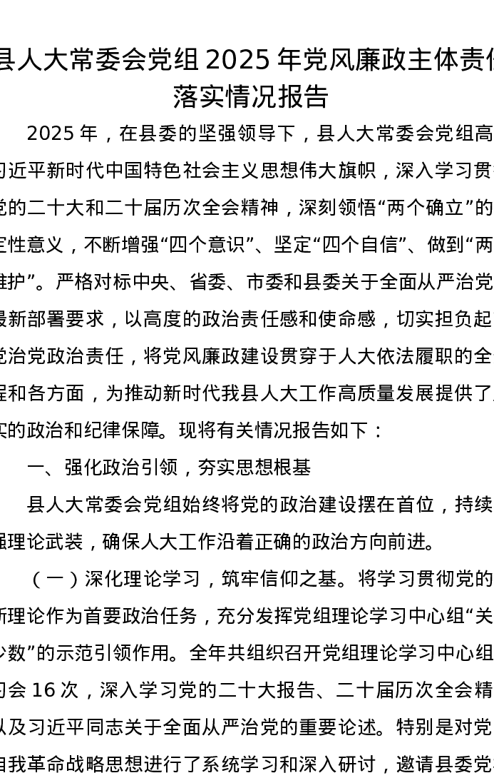 县人大常委会党组2025年党风廉政主体责任落实情况报告