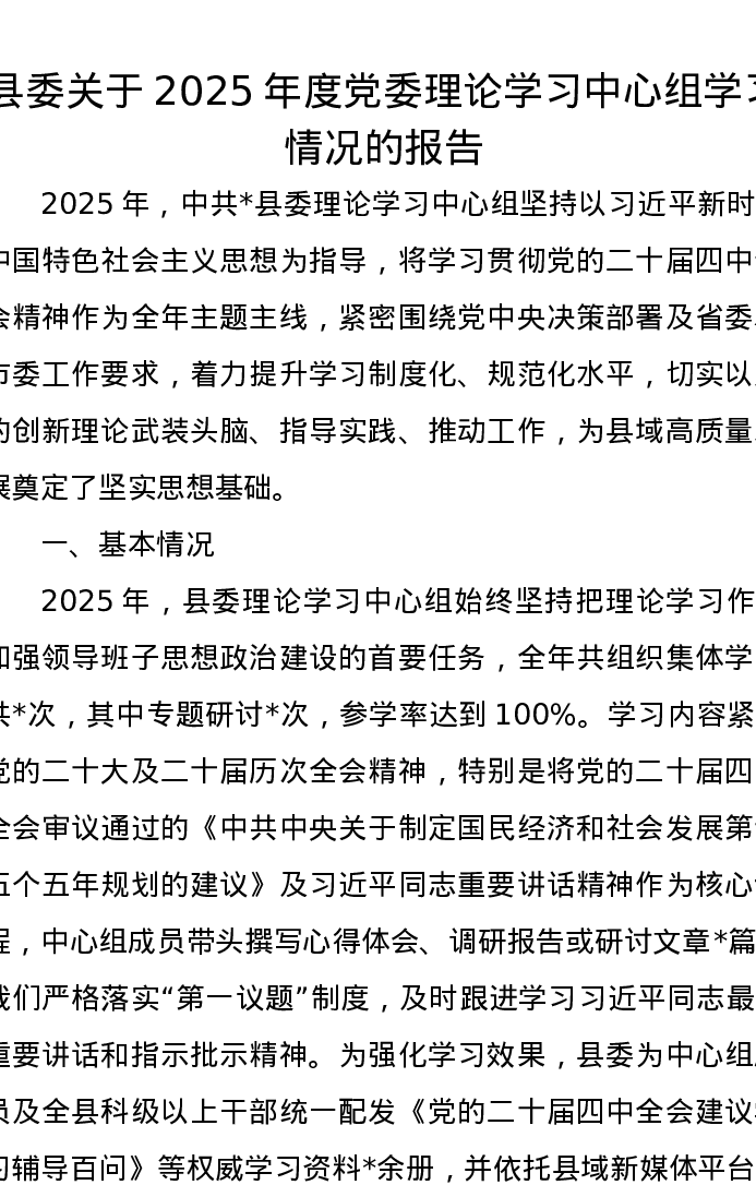 县委关于2025年度党委理论学习中心组学习情况的报告