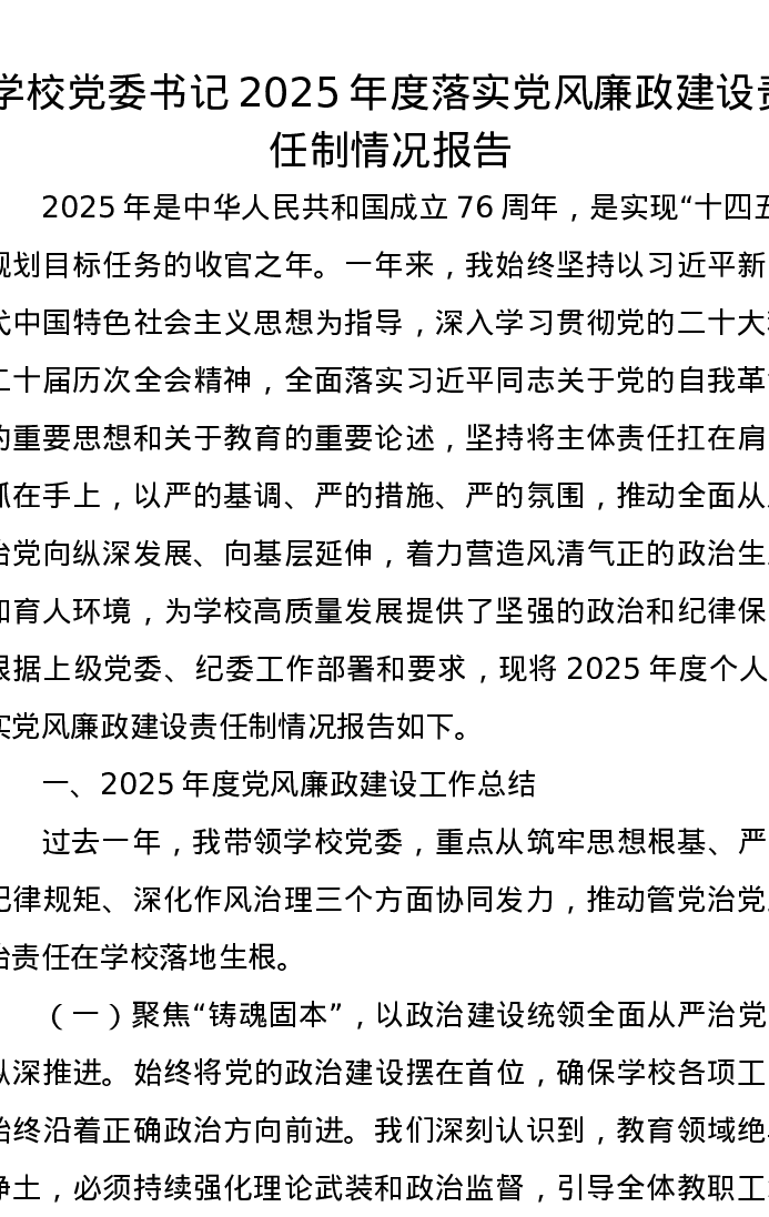 学校党委书记2025年度落实党风廉政建设责任制情况报告