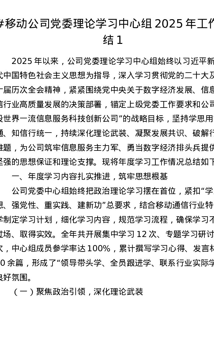 移动公司党委理论学习中心组2025年工作总结1