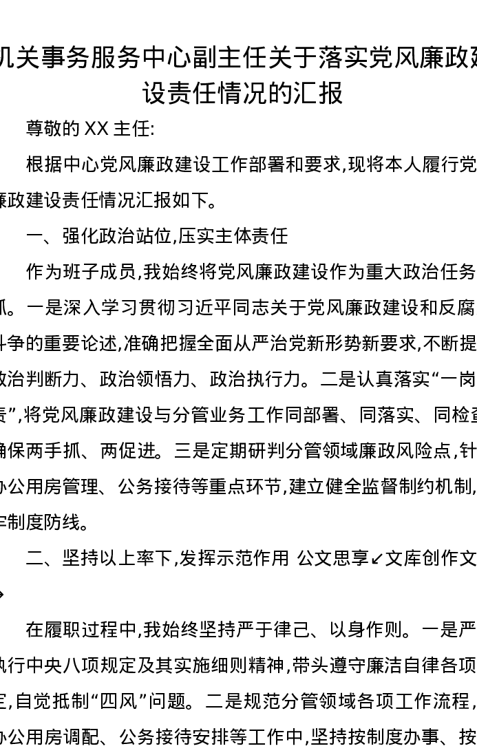 机关事务服务中心副主任关于落实党风廉政建设责任情况的汇报