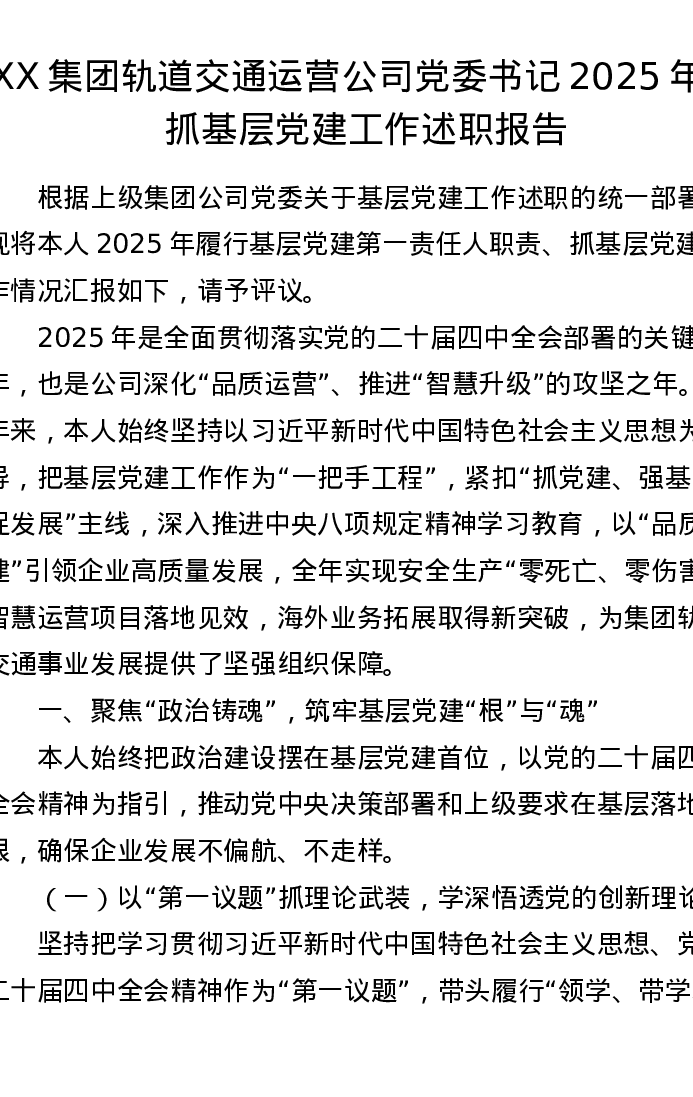 XX集团轨道交通运营公司党委书记2025年度抓基层党建工作述职报告