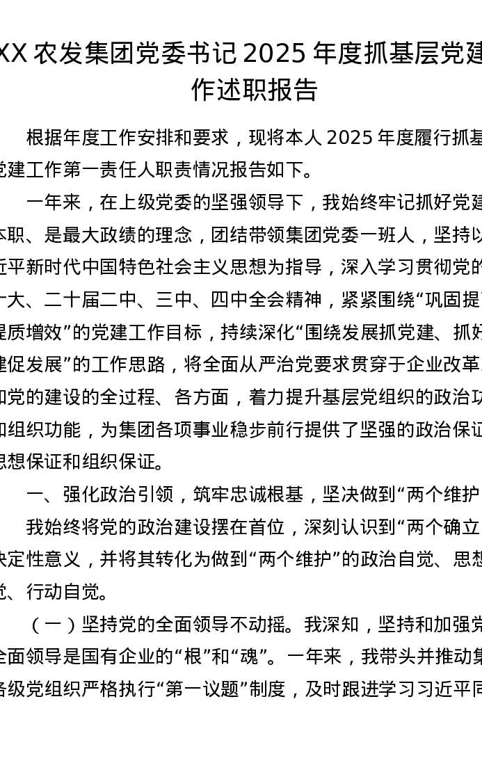 XX农发集团党委书记2025年度抓基层党建工作述职报告