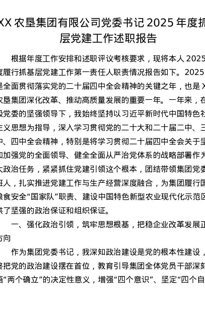 XX农垦集团有限公司党委书记2025年度抓基层党建工作述职报告