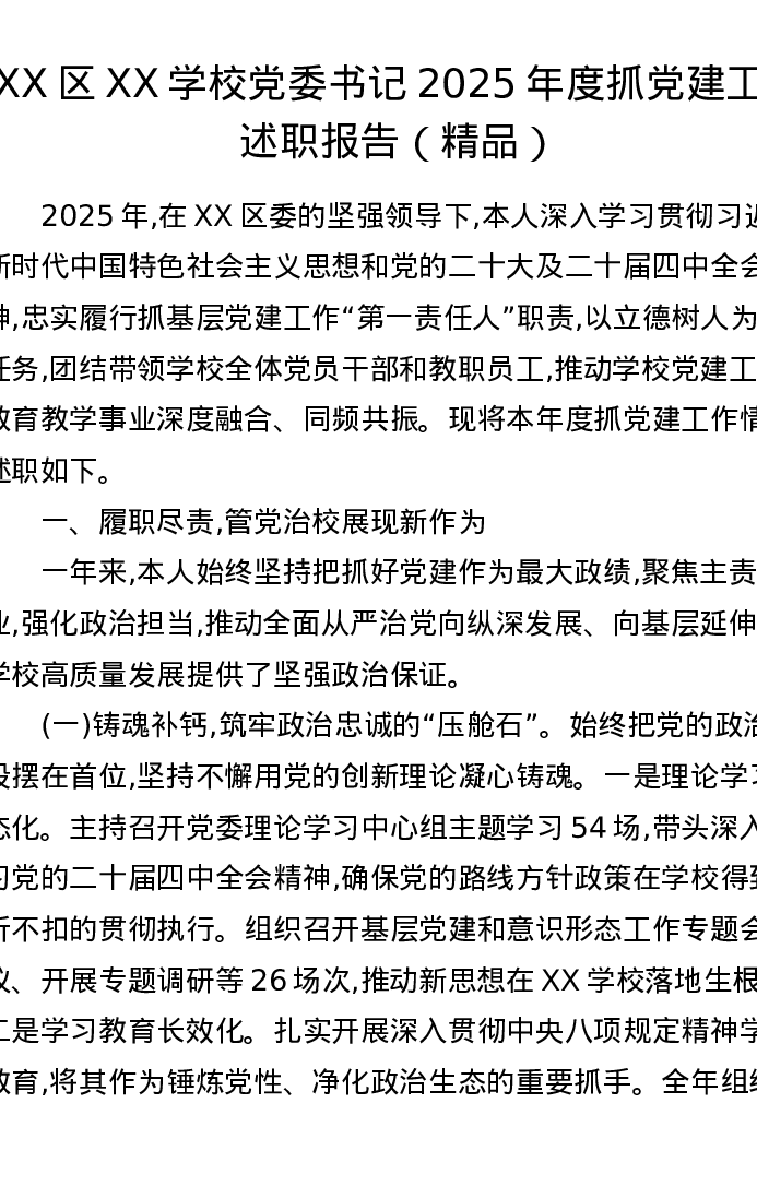 XX区XX学校党委书记2025年度抓党建工作述职报告
