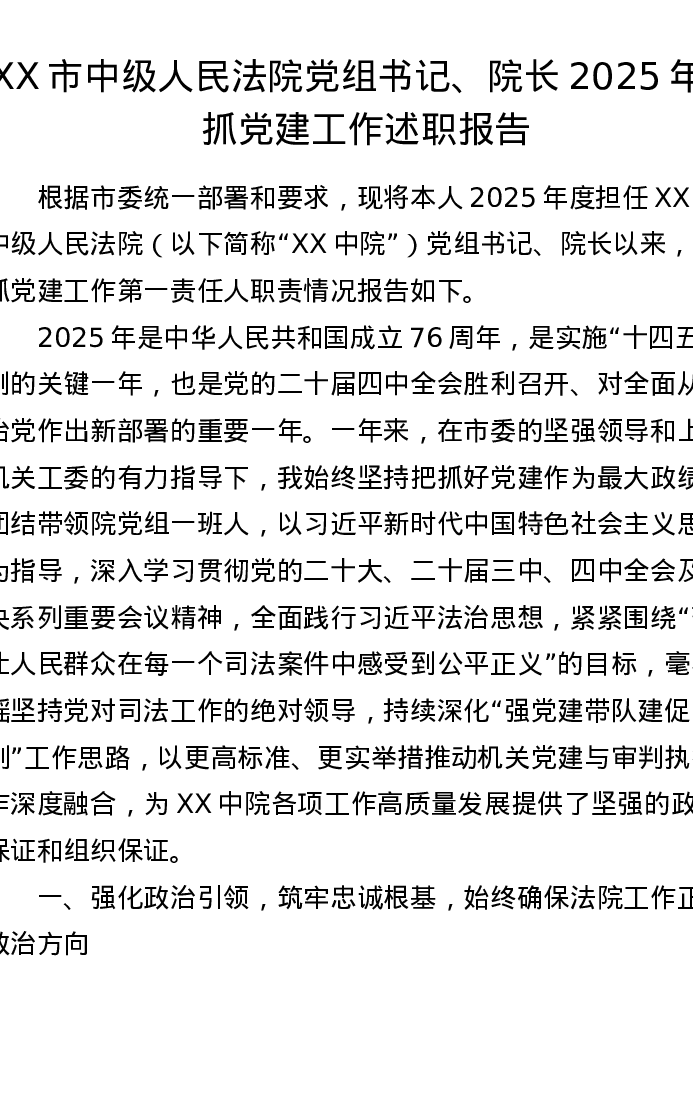XX市中级人民法院党组书记、院长2025年度抓党建工作述职报告