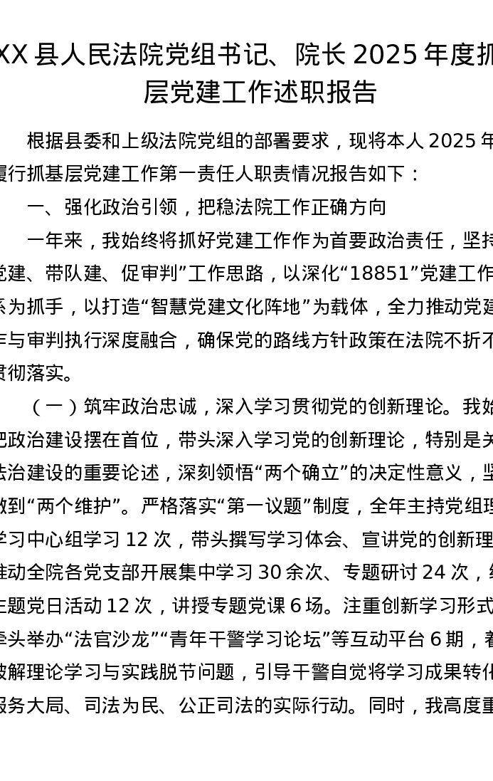 XX县人民法院党组书记、院长2025年度抓基层党建工作述职报告