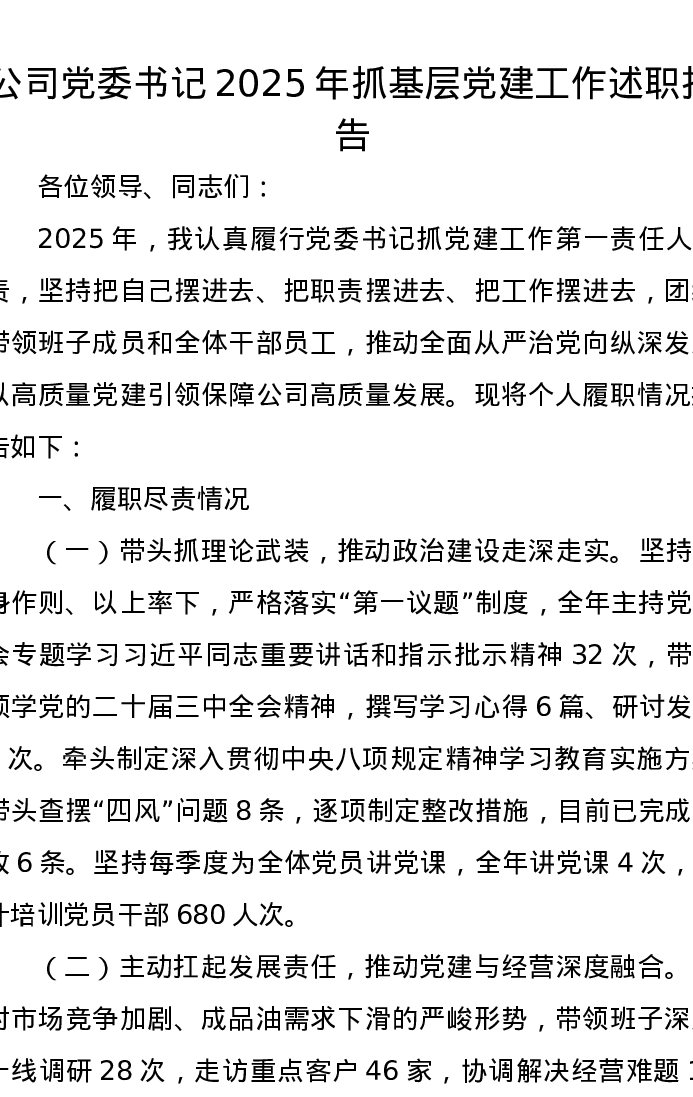 公司党委书记2025年抓基层党建工作述职报告