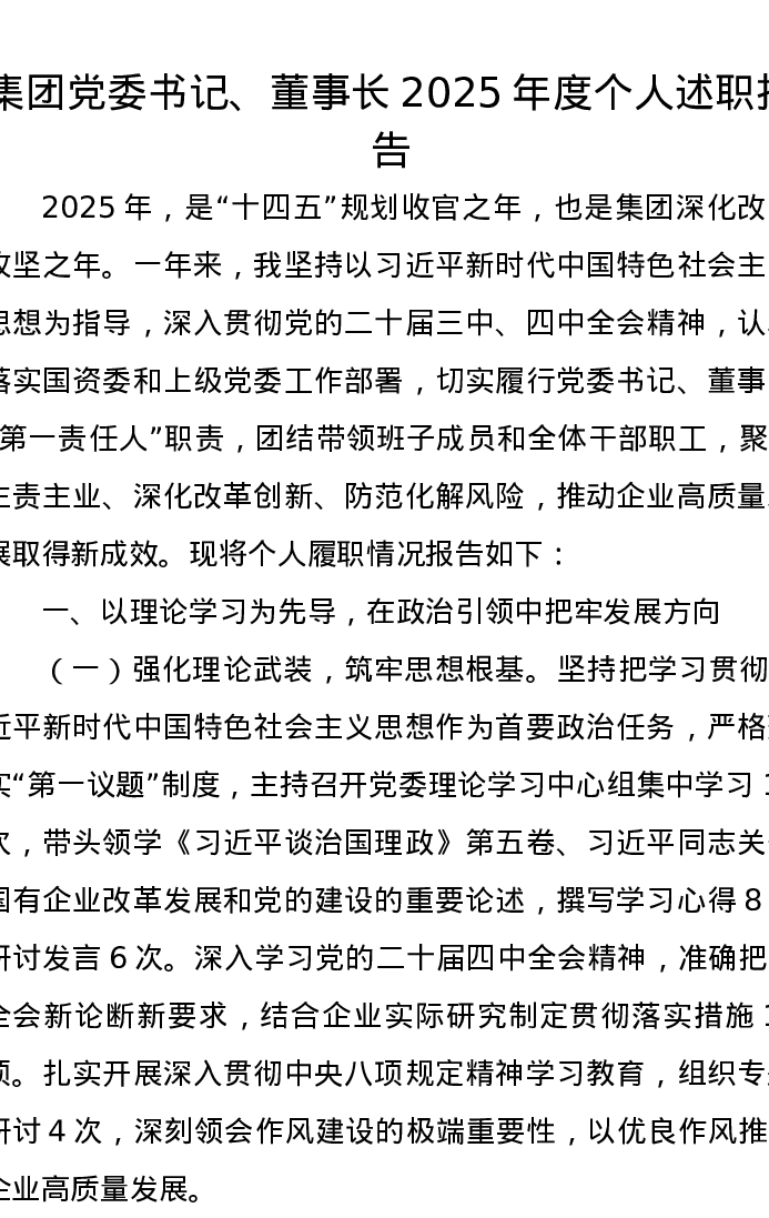 集团党委书记、董事长2025年度个人述职报告