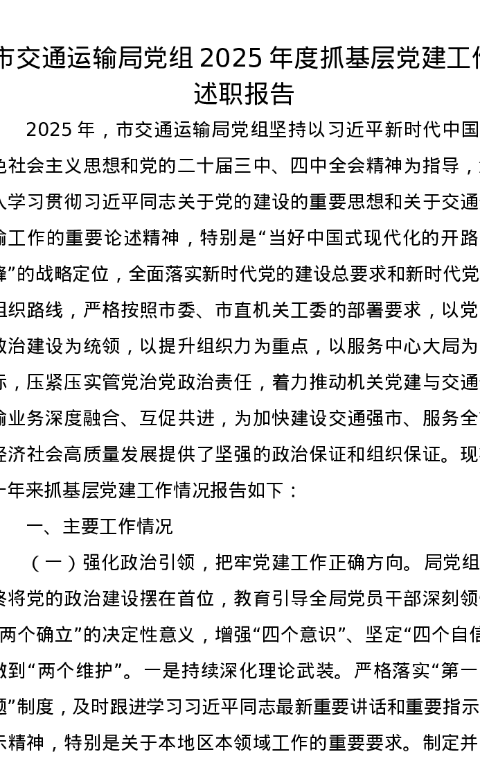 市交通运输局党组2025年度抓基层党建工作述职报告