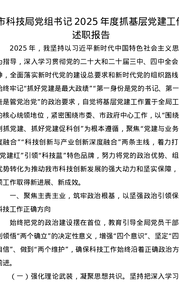 市科技局党组书记2025年度抓基层党建工作述职报告