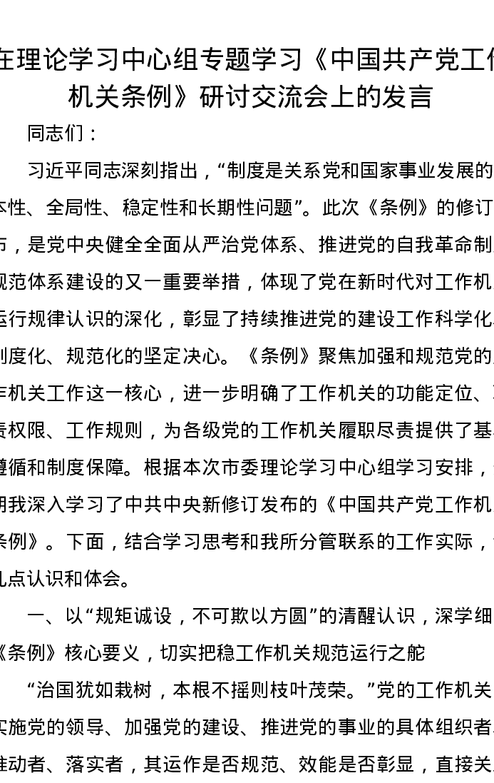 在理论学习中心组专题学习《中国共产党工作机关条例》研讨交流会上的发言