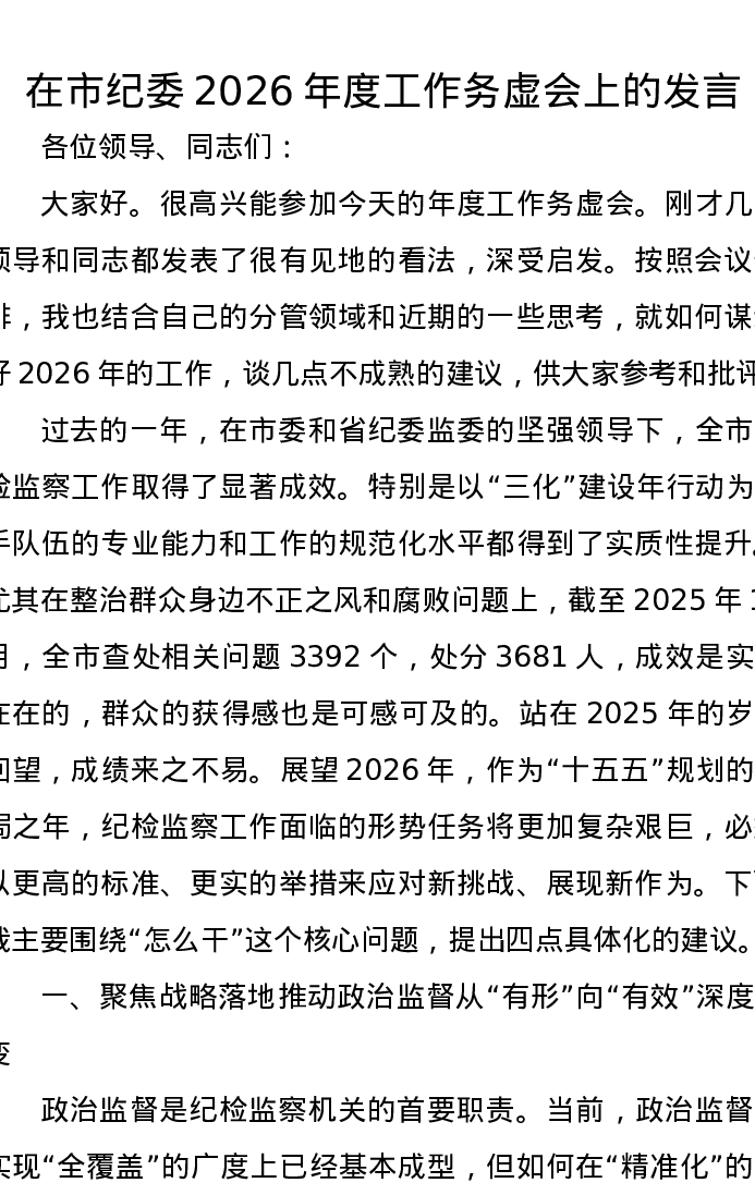 在市纪委2026年度工作务虚会上的发言