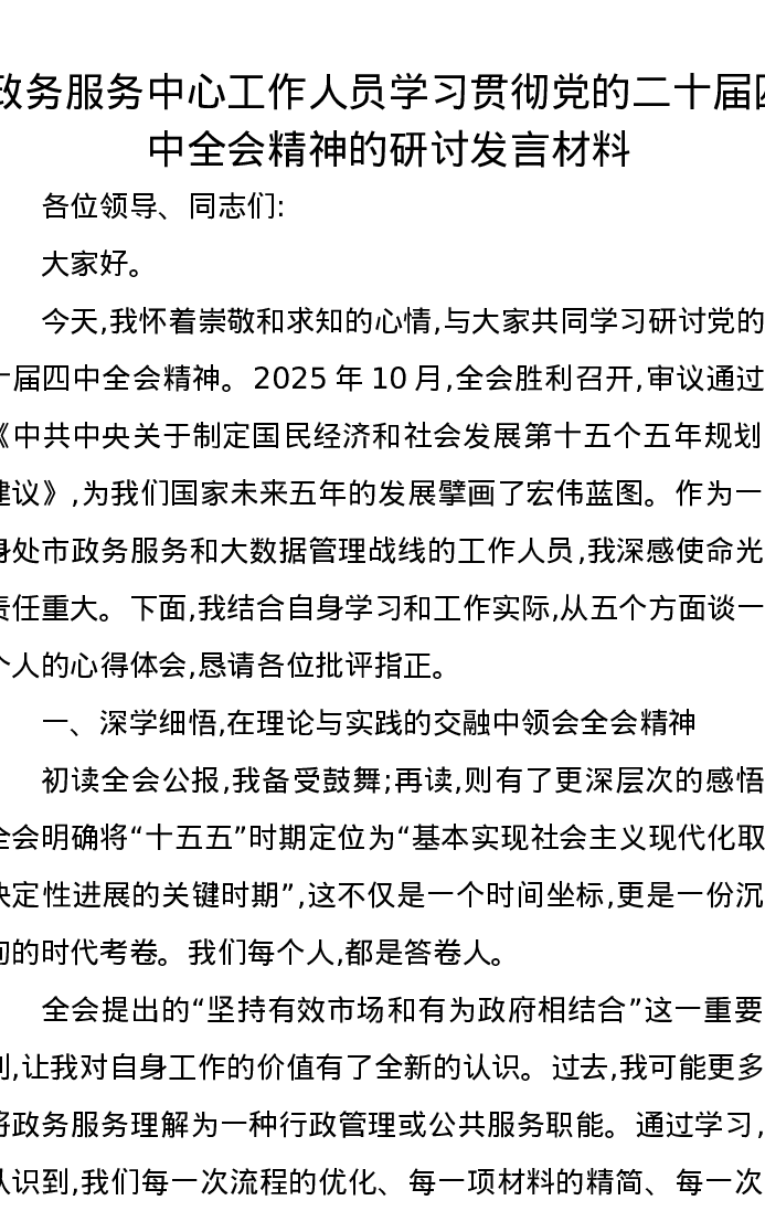 政务服务中心工作人员学习贯彻党的二十届四中全会精神的研讨发言材料