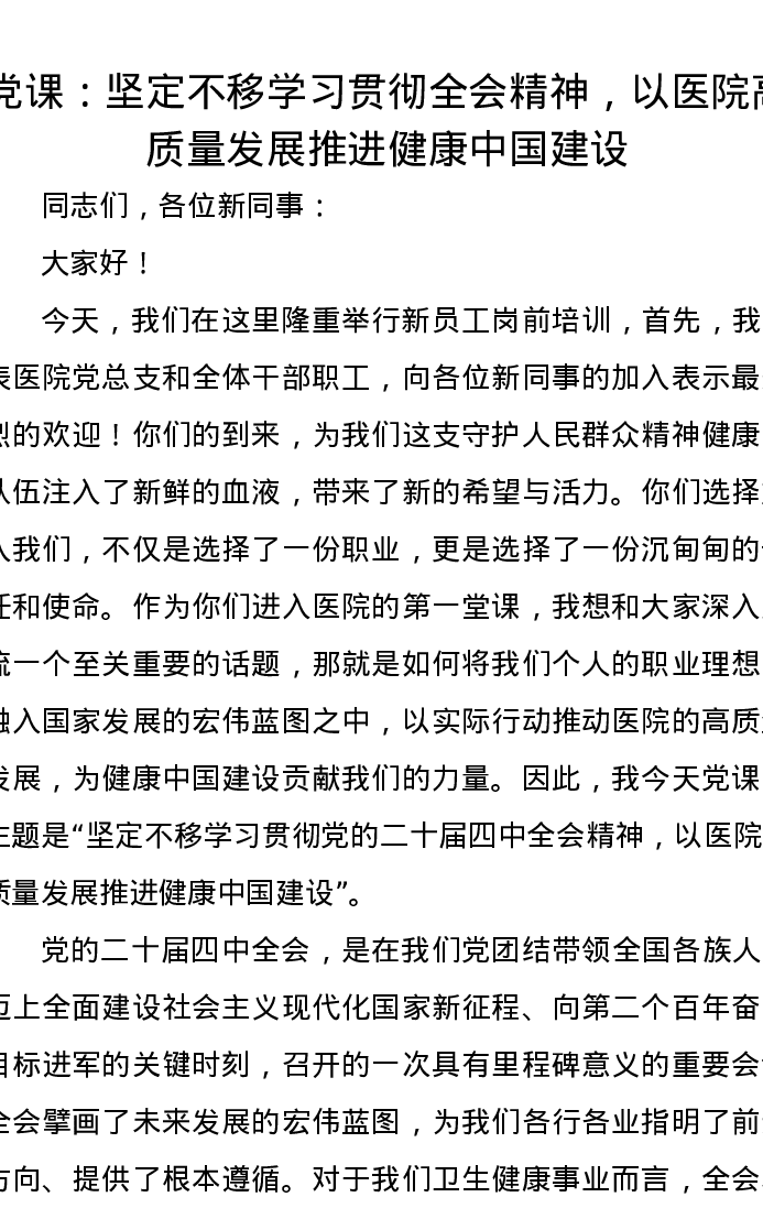 党课讲稿:坚定不移学习贯彻全会精神,以医院高质量发展推进健康中国建设