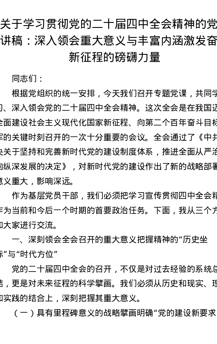 关于学习贯彻党的二十届四中全会精神的党课讲稿:深入领会重大意义与丰富内涵 激发奋进新征程的磅礴力量