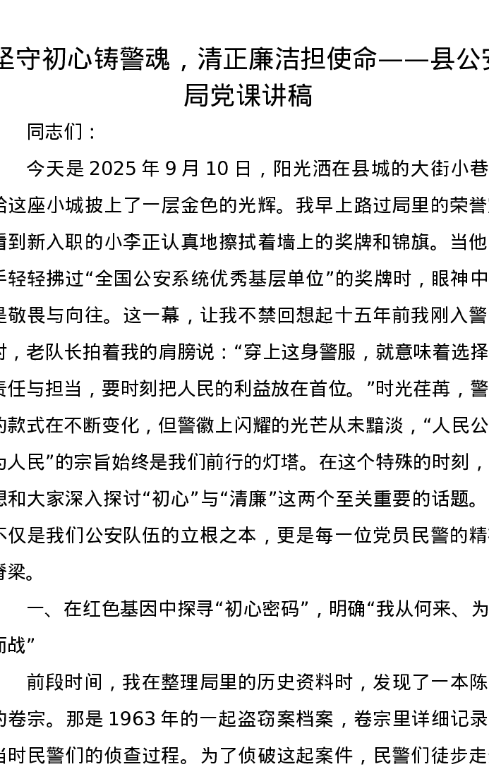 坚守初心铸警魂,清正廉洁担使命——县公安局党课讲稿