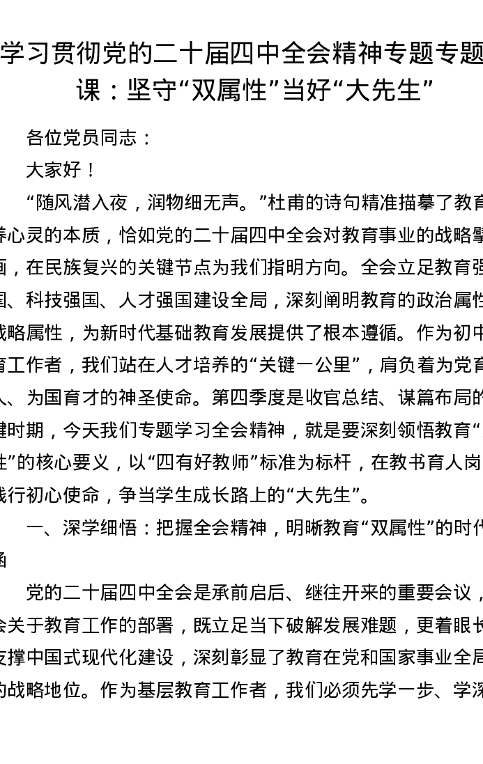 学习贯彻党的二十届四中全会精神专题专题党课讲稿:坚守双属性当好大先生