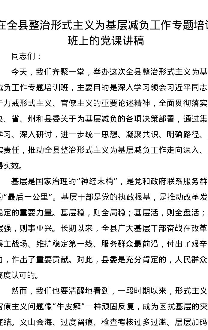 在全县整治形式主义为基层减负工作专题培训班上的党课讲稿
