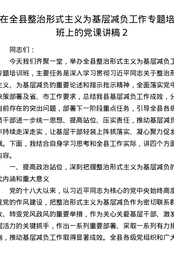 在全县整治形式主义为基层减负工作专题培训班上的党课讲稿2