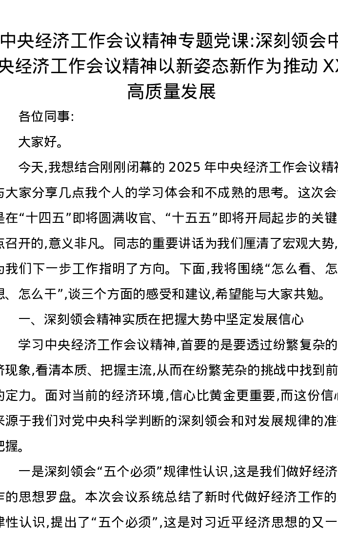 中央经济工作会议精神专题党课讲稿:深刻领会中央经济工作会议精神以新姿态新作为推动XX高质量发展