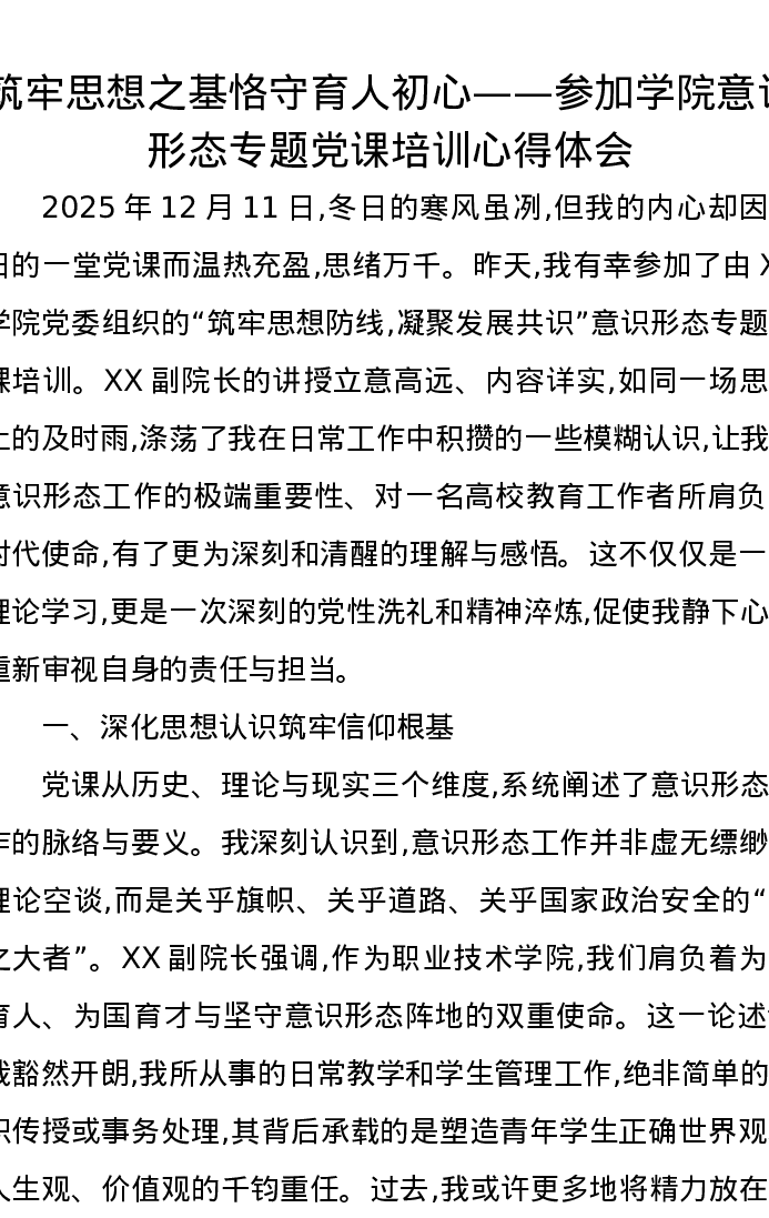 筑牢思想之基恪守育人初心——参加学院意识形态专题党课培训心得体会