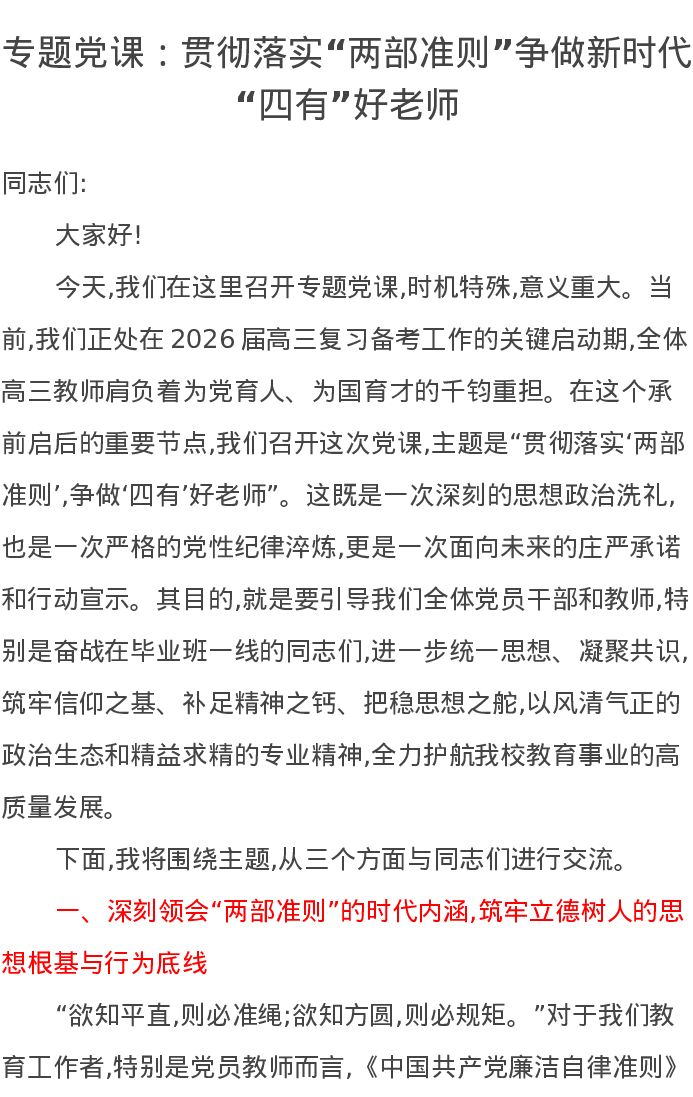 专题党课讲稿:贯彻落实两部准则争做新时代四有好老师
