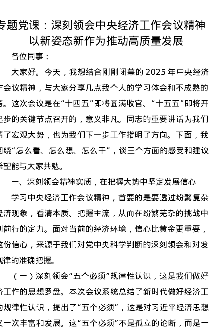 专题党课讲稿:深刻领会中央经济工作会议精神,以新姿态新作为推动高质量发展