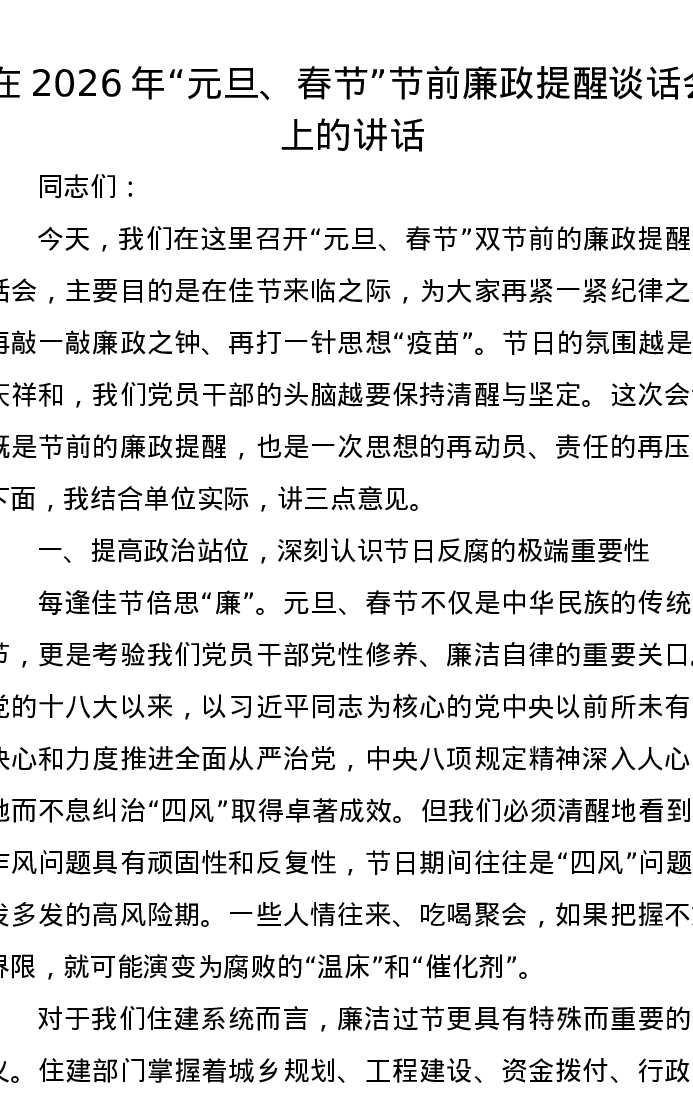 在2026年元旦、春节节前廉政提醒谈话会上的讲话